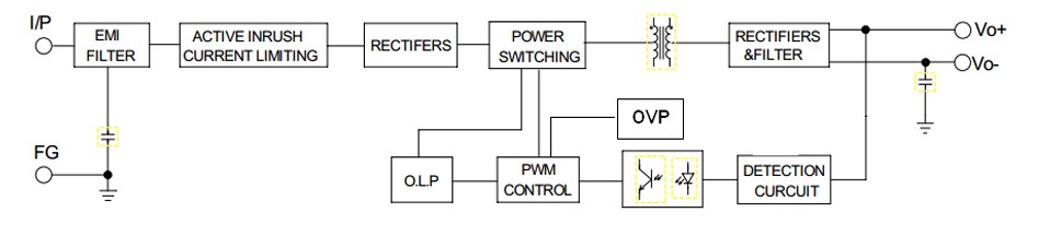 | Dải điện áp đầu vào | 90~264Vac; 120~370Vdc | ||