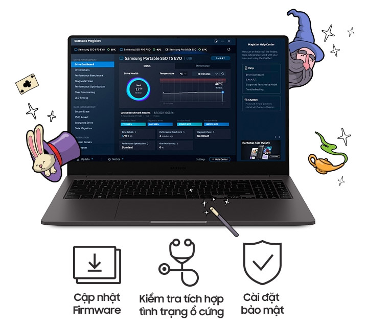 Khai thác triệt để sức mạnh của ổ cứng di động SSD Samsung T5 EVO với phần mềm Samsung Magician – một bộ công cụ thân thiện với người dùng giúp tối ưu hóa tác vụ quản lý nhằm đảm bảo hiệu suất tốt nhất cho ổ cứng SSD di động. Thuận tiện bảo vệ dữ liệu quan trọng, theo dõi tình trạng ổ cứng và cập nhật firmware mới nhất.