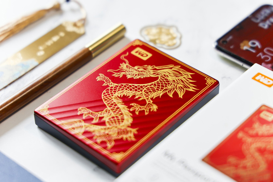 — WD My Passport Ultra Dragon bản giới hạn có vỏ kim loại màu đỏ bóng bẩy với họa tiết Rồng màu vàng gold sang trọng