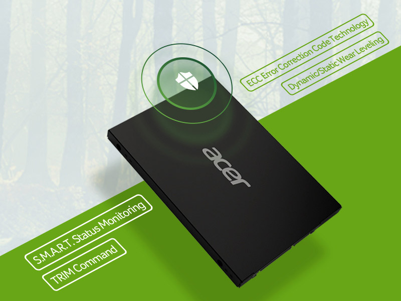 Dòng ổ cứng SSD này hỗ trợ Dynamic/Static Wear Leveling (cân bằng hao mòn dynamic/static), lệnh TRIM, Chức năng S.M.A.R.T và Công nghệ mã sửa lỗi ECC (2K LDPC) để đạt được độ tin cậy và độ bền cao nhất. Ổ SSD Acer này cũng đi kèm với một phiên bản miễn phí của phần mềm sao lưu Acronis.