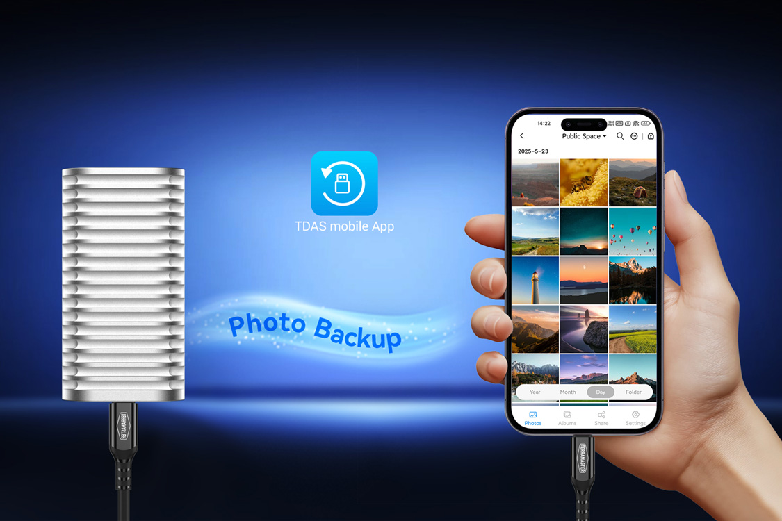 Một điểm nổi bật của TerraMaster D1 SSD Plus là khả năng sao lưu ảnh và video trực tiếp từ điện thoại di động thông qua ứng dụng TDAS Photo Backup độc quyền của TerraMaster.