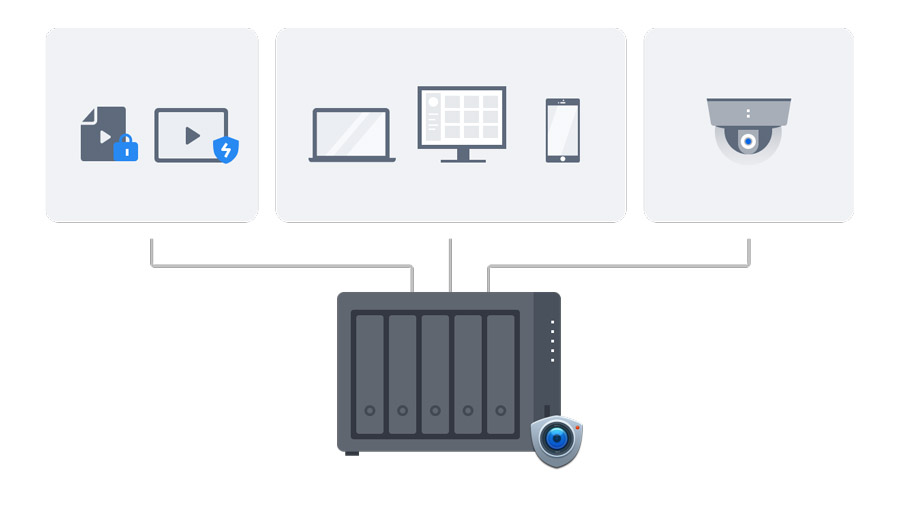 Ngoài chức năng lưu trữ, Synology DS1525+ còn có thể đóng vai trò trung tâm giám sát an ninh với phần mềm Surveillance Station. Thiết bị hỗ trợ kết nối lên đến 40 camera IP, cho phép quản lý video an ninh tập trung, ghi hình, phát hiện chuyển động và gửi cảnh báo theo thời gian thực – một lựa chọn đáng tin cậy cho văn phòng, nhà máy và cửa hàng bán lẻ.