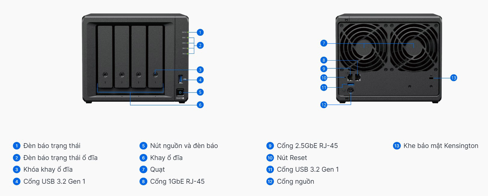 Khay ổ đĩa: 4 khay hỗ trợ ổ cứng 3.5" SATA HDD, 2.5" SATA SSD và M.2 2280 NVMe SSD