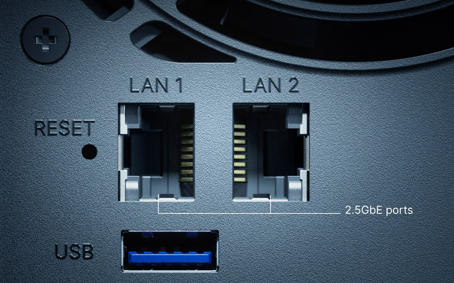 Synology DS925+ tích hợp hai cổng mạng 2.5GbE RJ-45 hỗ trợ Link Aggregation và Failover, giúp tăng băng thông truyền tải dữ liệu và cải thiện hiệu suất mạng. Thiết bị cũng hỗ trợ hai khe cắm M.2 NVMe SSD, cho phép sử dụng bộ nhớ đệm để tăng tốc độ truy xuất dữ liệu hoặc tạo storage pool. Ngoài ra, DS925+ có thể mở rộng lên đến 9 khay ổ cứng khi kết nối với thiết bị mở rộng DX525 qua cổng USB-C, nâng tổng dung lượng lưu trữ thô lên đến 180 TB khi sử dụng ổ 20TB.