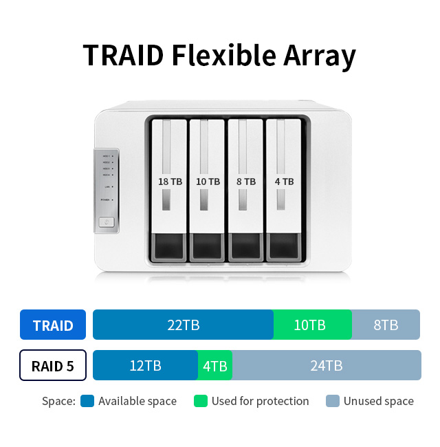 TerraMaster F4-423 hỗ trợ nhiều loại RAID khác nhau bao gồm Single/RAID 0/1/5/6/10. Nó cung cấp khả năng mở rộng dung lượng trực tuyến và di chuyển trực tuyến cho các loại RAID. Hot Spare có thể được cấu hình cho mảng đĩa. Nó hỗ trợ việc tạo nhiều không gian lưu trữ và có thể lựa chọn hệ thống tệp ext 4 hoặc BTRFS theo các yêu cầu kinh doanh khác nhau. Khi được sử dụng kết hợp với các thiết bị TerraMaster USB DAS, F4-423 có khả năng mở rộng dung lượng lưu trữ một cách linh hoạt.