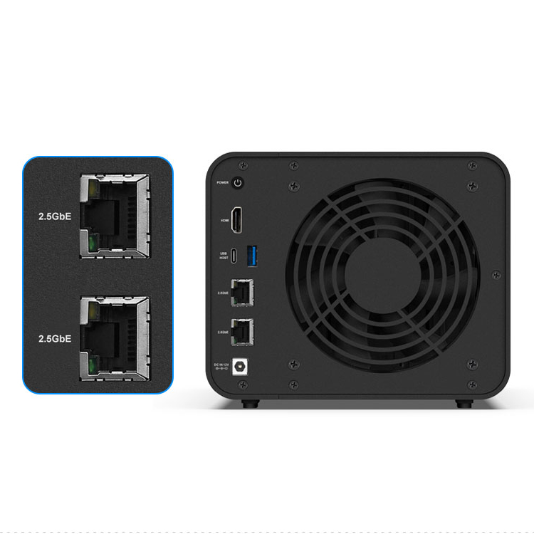 TNAS F4-424 Pro có hai cổng chuẩn 2,5 GbE, hỗ trợ băng thông mạng tốc độ cao 2,5 GbE. Tốc độ truyền dữ liệu tuyến tính có thể đạt 283 MB/s (Seagate IronWolf 18TB x 4, RAID 0). Link Aggregation cung cấp băng thông mạng lên tới 5 Gb, từ đó cung cấp giải pháp tiết kiệm chi phí cho việc truy cập tệp đồng thời cao và nhiều người dùng.